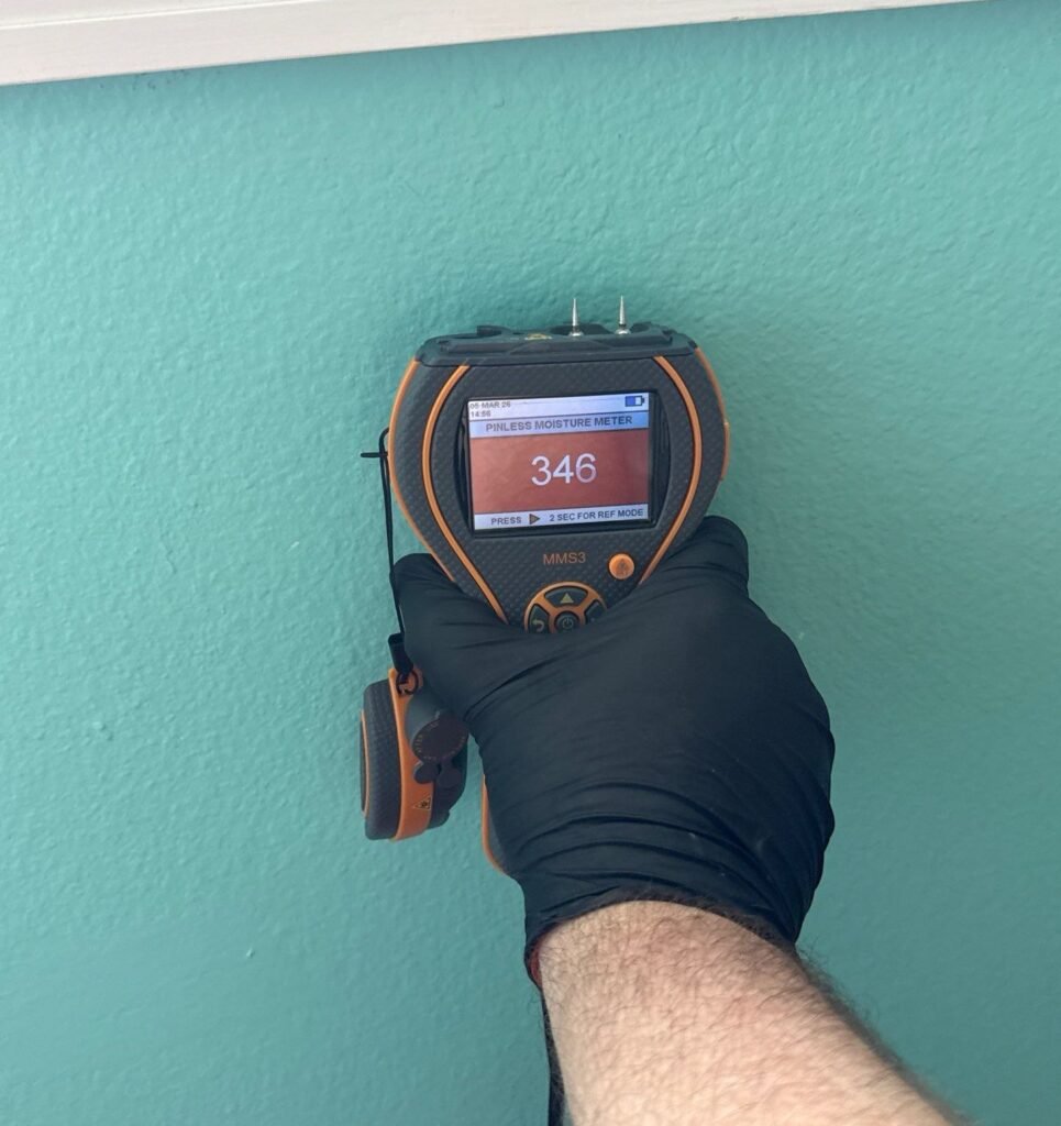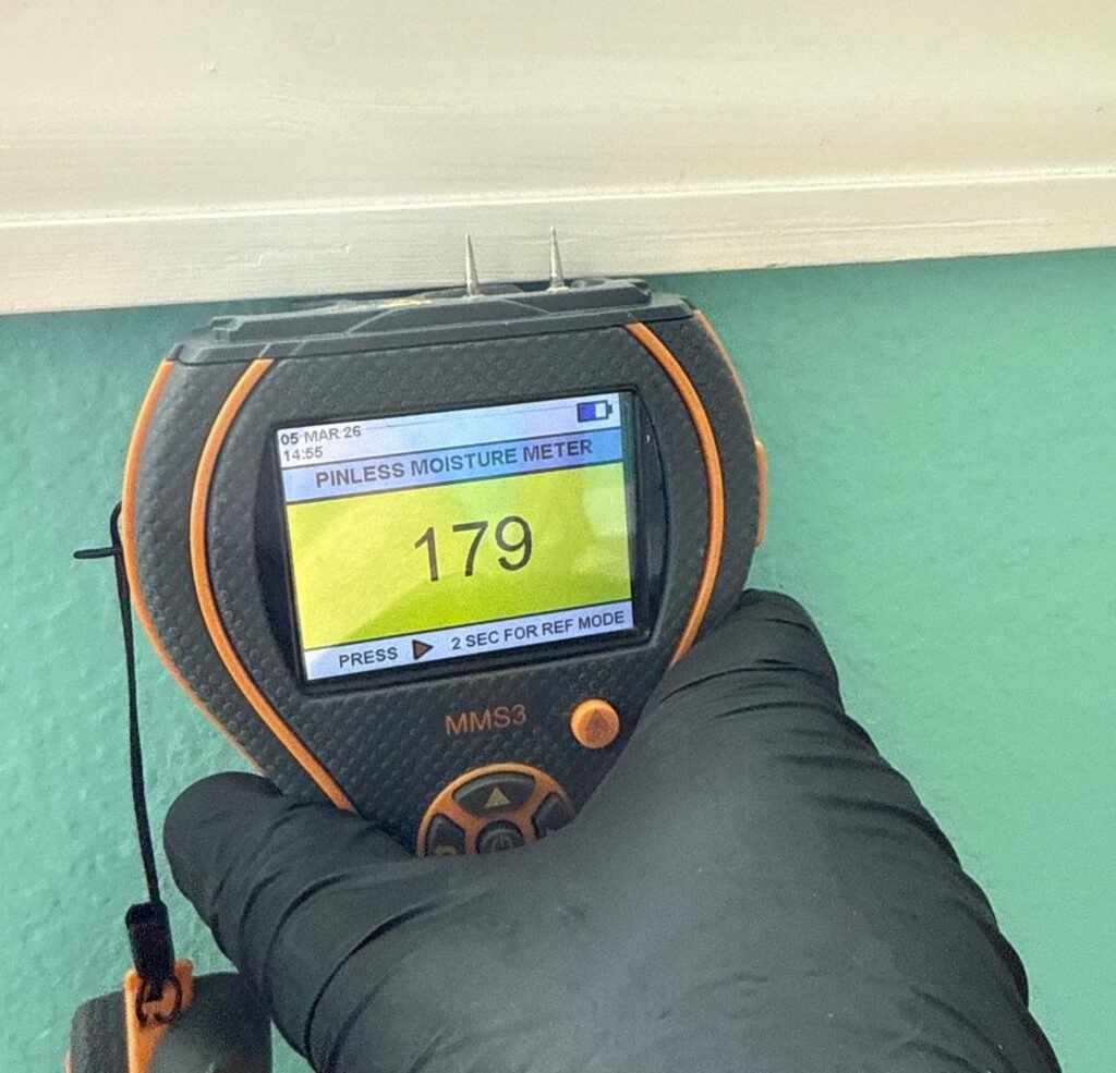 We follow that with calibrated moisture meters to take precise readings at specific points throughout the property, giving us exact data on where moisture levels are elevated and by how much.